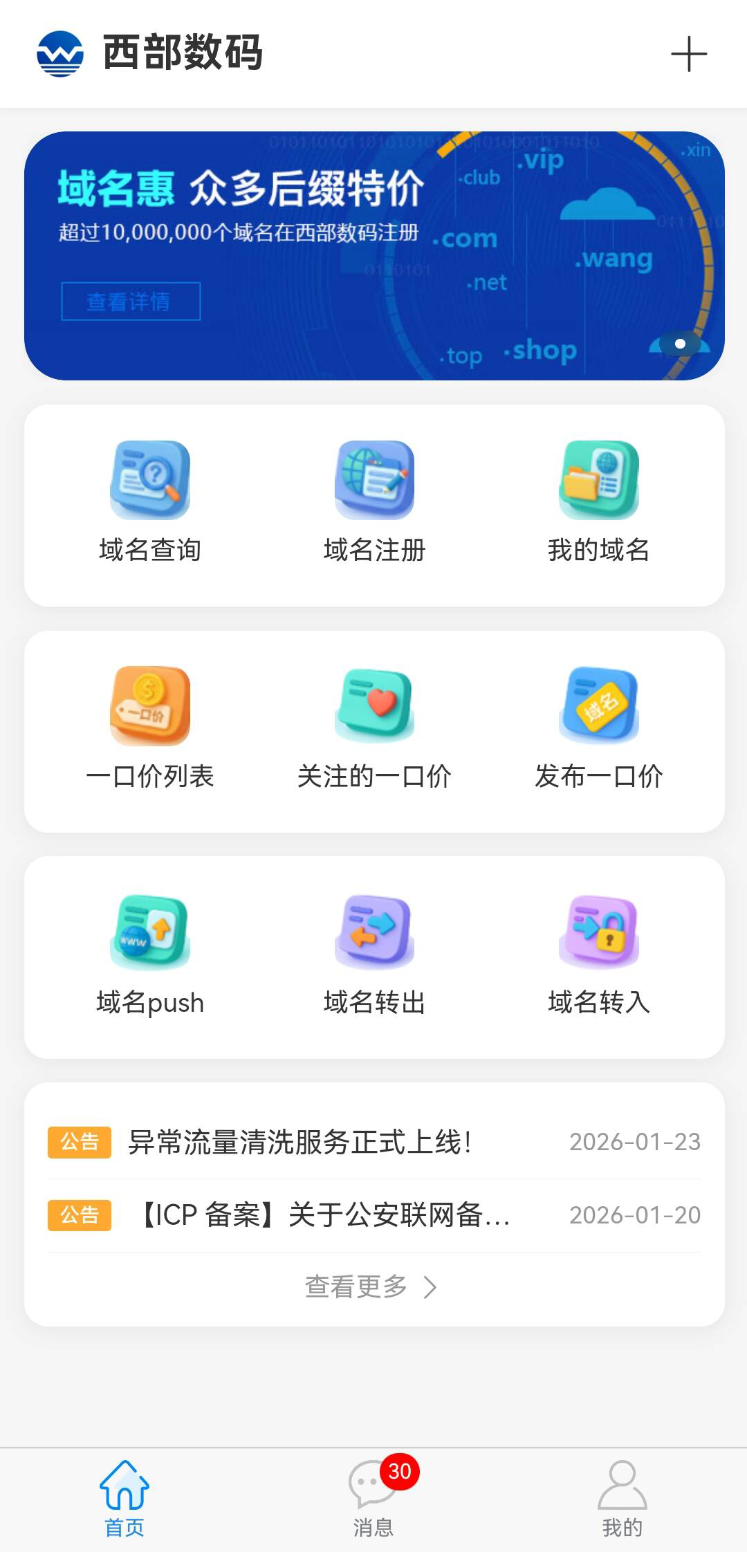 應(yīng)用名稱:西部數(shù)碼 應(yīng)用版本:1.2.7 開發(fā)者:成都西維數(shù)碼科技有限公司 更新時(shí)間:2026年1月23日 應(yīng)用涉及權(quán)限:查看詳情       隱私政策:查看詳情 功能介紹:查看詳情