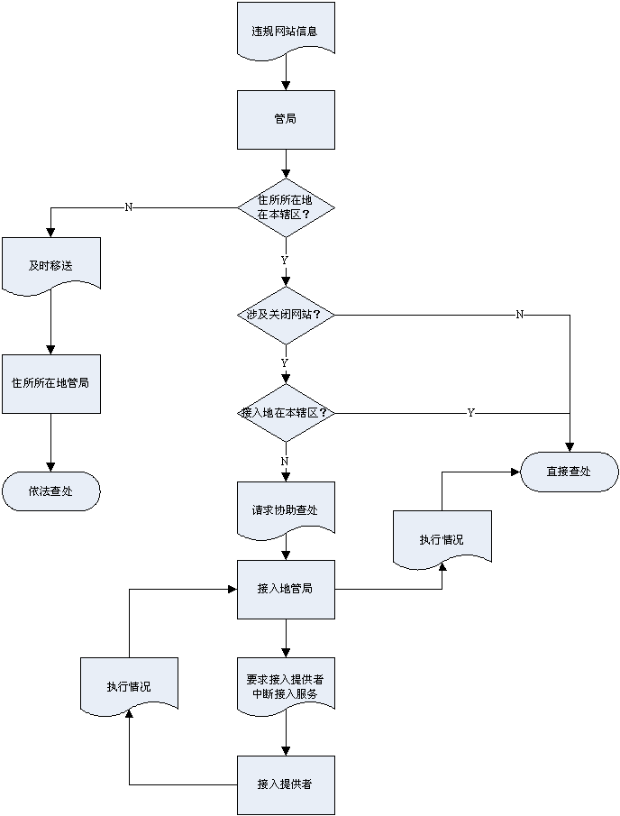 (一)省通信管理局根據(jù)涉嫌違法違規(guī)網(wǎng)站線索(包括舉報(bào)材料、省通信管理局例行檢查、信息產(chǎn)業(yè)部的通報(bào)、相關(guān)部門(mén)要求協(xié)助查處意見(jiàn)等),對(duì)確屬違法違規(guī)網(wǎng)站進(jìn)行依法處理