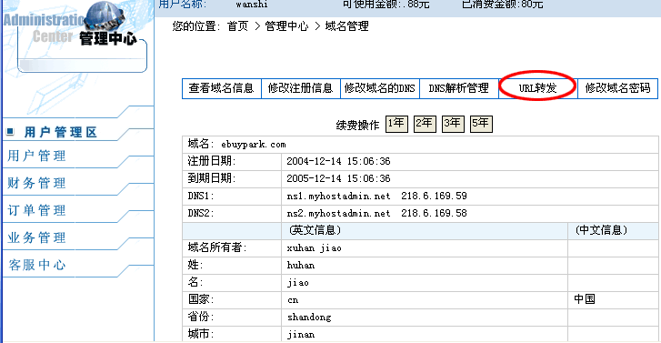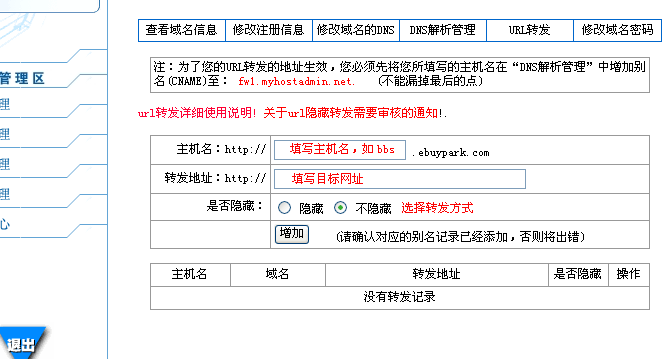 域名解析演示視頻 域名轉(zhuǎn)發(fā)演示視頻 URL轉(zhuǎn)發(fā)是指當(dāng)用戶在瀏覽器輸入某個(gè)域名時(shí),打開此域名對(duì)應(yīng)的另外一個(gè)網(wǎng)址.例如,將http://bbs.ebuypark.com轉(zhuǎn)發(fā)到http://www.ebuypark.com/bbs時(shí),用戶輸入bbs.ebuypark.com訪問的實(shí)際是www.ebuypark.com/bbs的內(nèi)容. 轉(zhuǎn)發(fā)方式有兩種:隱藏與非隱藏,采用隱藏轉(zhuǎn)發(fā)時(shí),用戶在瀏覽器地址欄看到的是原來的域名,如上例,用戶輸入bbs.ebuypark.com時(shí)訪問的雖是http://www.ebuypark.com/bbs的內(nèi)容,但瀏覽器地址欄顯示的還是"bbs.ebuypark.com",而采用非隱藏轉(zhuǎn)發(fā)時(shí),瀏覽器地址欄將顯示實(shí)際地址http://www.ebuypark.com/bbs. 我司注冊(cè)的域名支持隱藏與非隱藏轉(zhuǎn)發(fā),但隱藏轉(zhuǎn)發(fā)需要通過審核才能生效!