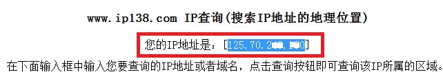 一個(gè)最快捷的方式:打開(kāi)www.ip138.com網(wǎng)站,網(wǎng)站上會(huì)自動(dòng)獲取到您的IP地址,如下圖所示,筆者本機(jī)的IP地址是125.70.210.120:
