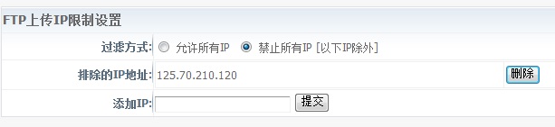 4. 點(diǎn)擊上圖中“設(shè)置FTP登錄的IP范圍”進(jìn)入FTP登錄IP地址范圍限制,填寫限制IP地址,如下圖所示: