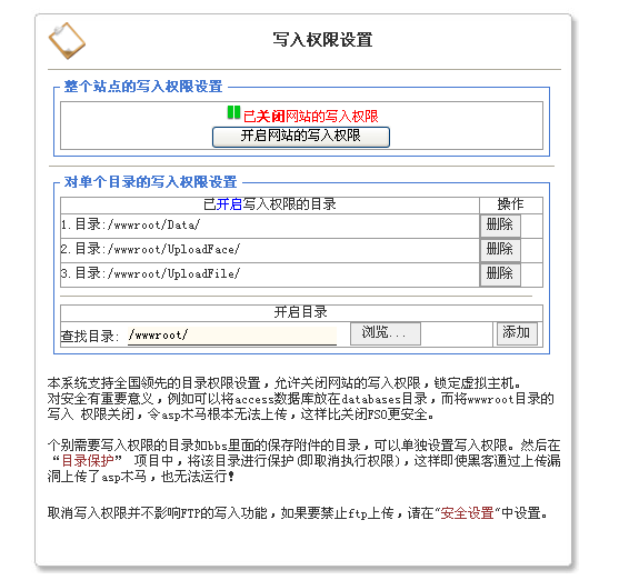 1.論壇安裝設(shè)置好以后,我們基本上不再需要進(jìn)行多少修改,常見的設(shè)置在動(dòng)網(wǎng)后臺(tái)就可以設(shè)置。因此我們關(guān)閉整個(gè)網(wǎng)站的寫入權(quán)限,在文件管理中關(guān)閉整個(gè)wwwroot的寫入權(quán)限,只單獨(dú)打開