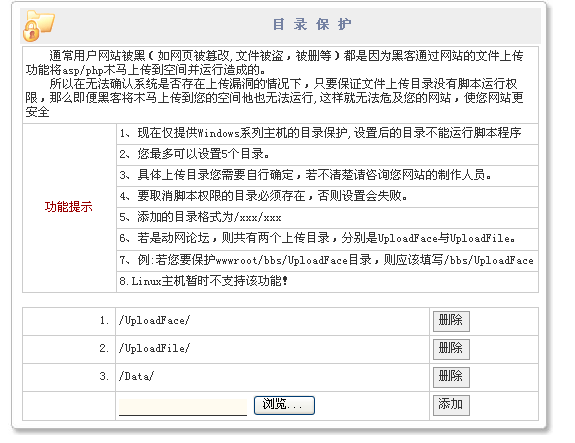 2.對(duì)于剛才開放的三個(gè)目錄,因?yàn)橛脩艨梢陨蟼鲌D片等,結(jié)合原來出現(xiàn)的動(dòng)網(wǎng)上傳漏洞,比較危險(xiǎn)。因此我們在“目錄保護(hù)”中設(shè)置這三個(gè)目錄為禁止執(zhí)行任何腳本。即使黑客上傳了木馬在這里面,也無法運(yùn)行。