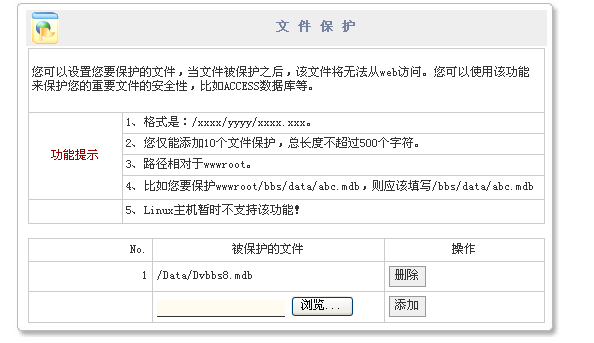 3.對(duì)于/Data/Dvbbs8.mdb 這個(gè)數(shù)據(jù)庫文件,建議改名。但經(jīng)常有些菜鳥是不會(huì)改名的,這里我們對(duì)它進(jìn)行“文件保護(hù)”,這樣該文件將無法從web訪問。防止數(shù)據(jù)庫被下載!