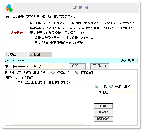 4.為了防止未知的注入漏洞,使黑客獲得了admin權(quán)限對(duì)論壇造成破壞,我們將/admin目錄設(shè)置為“所有計(jì)算機(jī)將被拒絕訪問”,在允許訪問的IP列表中,添加上我的C段: 218.6.1.x!∵@一招是讓黑客即使獲得了admin權(quán)限,或破解了超級(jí)管理員的密碼也無法登錄后臺(tái)管理!