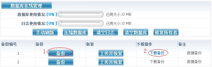 3、mssql數(shù)據(jù)庫備份(若沒有sqlserver數(shù)據(jù)庫請(qǐng)?zhí)^) 登錄我司網(wǎng)站,點(diǎn)擊“業(yè)務(wù)管理”——“mssql數(shù)據(jù)庫”——“管理”,進(jìn)入數(shù)據(jù)庫在線管理,點(diǎn)擊“備份”按鈕將數(shù)據(jù)庫備份為bak文件,再點(diǎn)擊“下載備份”,可以將備份文件下載到您本地或服務(wù)器。如圖:
