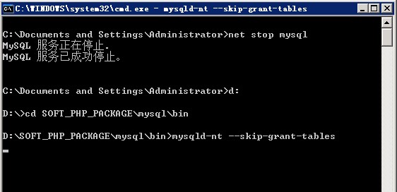 進入到D:\SOFT_PHP_PACKAGE\mysql\bin\ 目錄下,執(zhí)行mysqld --skip-grant-tables  啟動MySQL Server   (如果報錯,執(zhí)行mysqld-nt --skip-grant-tables)如圖:
