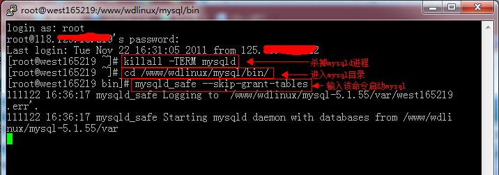 2、 使用`--skip-grant-tables' 參數(shù)來啟動 mysqld(/www/wdlinux/mysql/bin/為wdcp系統(tǒng)的mysql路徑,非此系統(tǒng)的,請變更mysql的路徑)。
