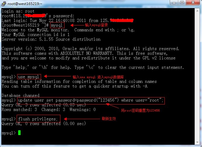 2、另外打開一個cmd窗口, 依次輸入以下命令,將root賬戶密碼重置為123456。(命令輸入部分用紅色標注)