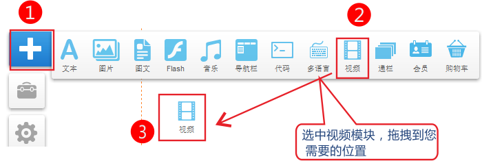 第二步:添加視頻。 剛才已經找出需要添加的視頻的URL,要將這個視頻添加到頁面中,點擊左邊的添加按鈕,將視頻模塊拖至頁面上,會彈出設置窗口,將第一步中準備的URL添加后保存,并預覽即可見到效果。 1.依次點擊 添加按鈕-》視頻。選中模塊拖拽到您需要的位置。