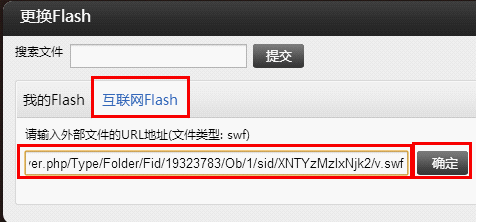 會彈出以下窗口“更換視頻”并打開文件夾中的Flash 選擇“我的Flash”和“互聯(lián)網Flash”,點擊“互聯(lián)網Flash”并將第一步中準備的URL添加后確認,并預覽即可見到效果。