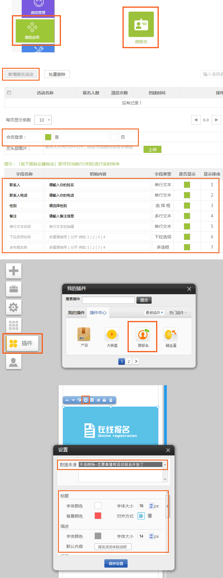 后臺:可以添加多個報名活動,自定義報名表單內(nèi)容,設(shè)定是否需要會員登錄,查看報名參加人員前臺:插件中心,新增微報名插件可選擇使用哪個報名數(shù)據(jù)可設(shè)置報名界面樣式