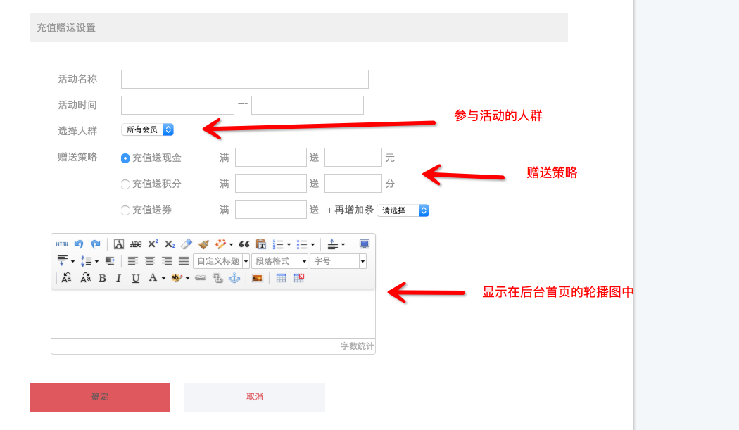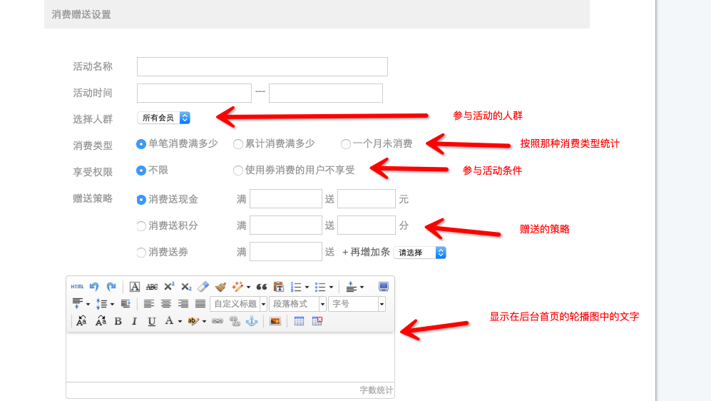 消費贈送是指當(dāng)消費達(dá)到一定的水平時就會獲得獎勵 2、添加消費贈送活動