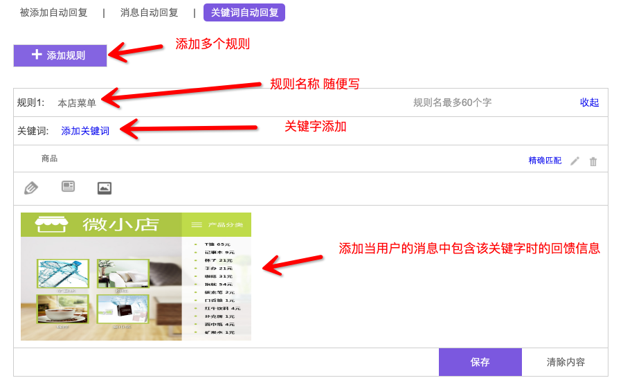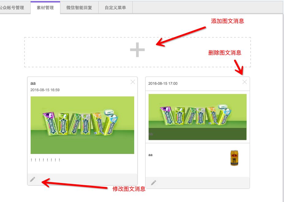 微小店微信管理1、素材管理素材管理是指添加一些圖文消息,可作為自動(dòng)回復(fù)內(nèi)容,或者通過(guò)自定義菜單打開