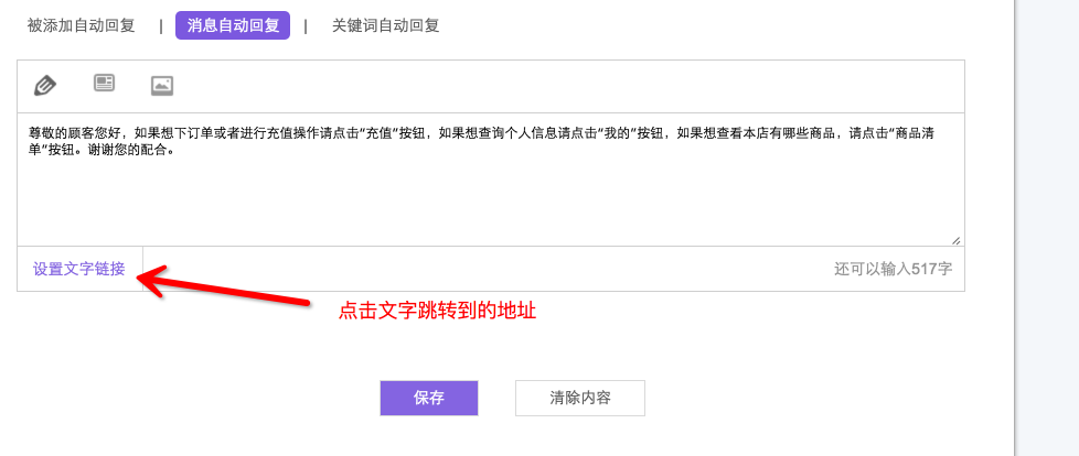 3關(guān)鍵字自動(dòng)回復(fù)關(guān)鍵字自動(dòng)回復(fù)是指當(dāng)用戶發(fā)送的消息中含有固定的字或詞將按照該關(guān)鍵字自動(dòng)回復(fù)的規(guī)則進(jìn)行回復(fù)。