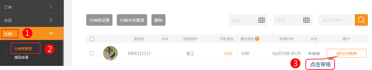 2.2  在后臺 分銷-》分銷商管理中手動審核