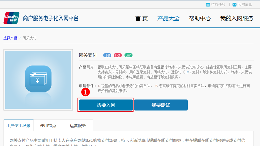 1、訪問(wèn) https://merchant.unionpay.com/join/product/detail?id=1 點(diǎn)擊我要入網(wǎng)