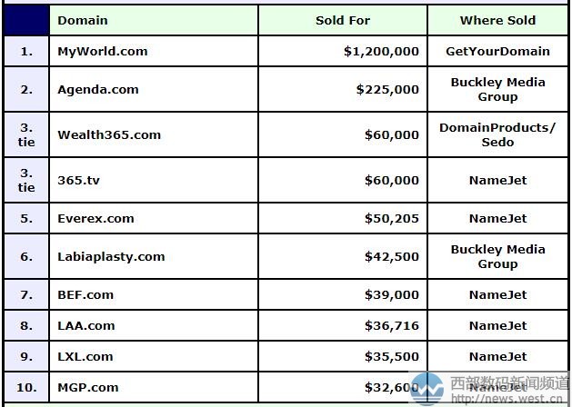 重磅:“我的世界”域名myworld.com以790萬元登頂DN榜西部數(shù)碼(west.cn)10月12日消息,國內(nèi)十一長假剛剛結(jié)束,國外就傳來了捷報(bào)。據(jù)最新一期的DN榜(9.25-10.8)顯示,一枚英文域名myworld.com以1,200,000美元高價結(jié)拍,約合人民幣791萬元,無懸念摘得本期DN榜桂冠。