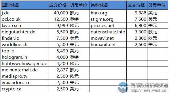 國別域名方面,單字母j.de可謂大放異彩,以49,000歐元高價成交。后綴.de是德國國別域名,字母J含義豐富,可與之組合的詞語也十分多,所以可應(yīng)用的空間相當(dāng)廣闊,市場價值不菲。