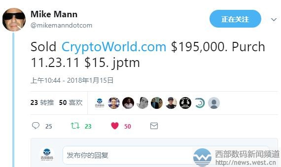 昨天上午,海外知名投資人Mike Man在推特上自曝:以195,000美元(約合人民幣125萬元)售出域名cryptoworld.com,而該域名于2011年收購時(shí)成本僅15美元。