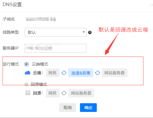 特別注意:設(shè)置好后看下截圖這個(gè)位置:  回源模式需要如截圖改為云端