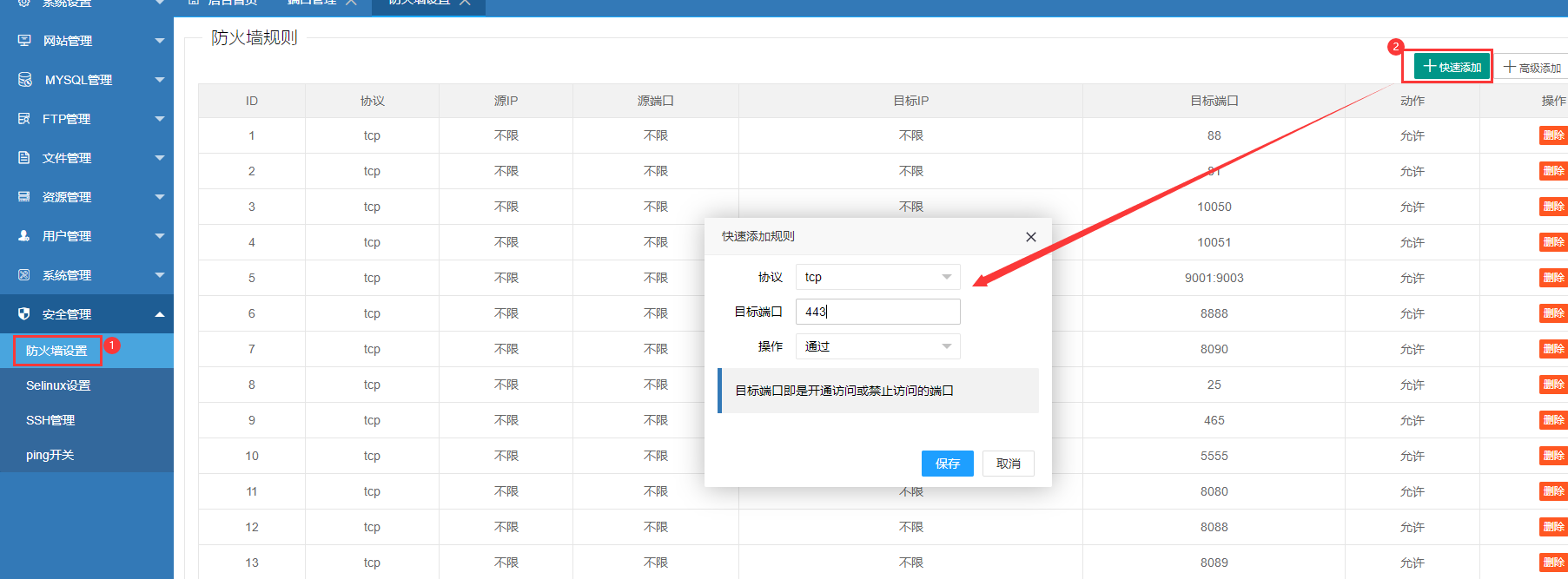 linux系統(tǒng)防火墻開(kāi)啟放行其他端口我司彈性云主機(jī)默認(rèn)在外部未對(duì)端口進(jìn)行限制,如果服務(wù)運(yùn)行后端口外部不通,可參考本教程在防火墻放行對(duì)應(yīng)端口。 1、WDCP 系統(tǒng)端口放行: (1)3.2版本 登錄wdcp面板后點(diǎn)擊“安全管理”——“防火墻設(shè)置”——“快速添加”,如圖填寫(xiě)端口(協(xié)議默認(rèn)都使用tcp),保存即可放行。