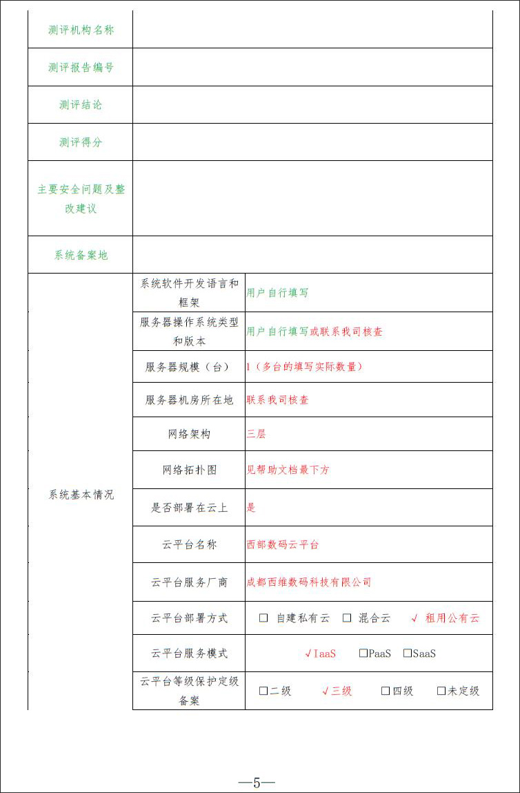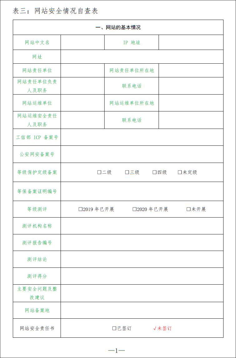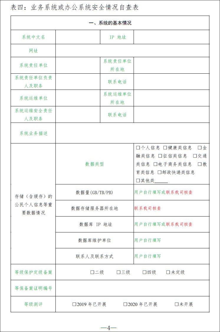 2020 年公安機(jī)關(guān)網(wǎng)絡(luò)安全監(jiān)督檢查自查表-填表說明此填表說明適用于《2020 年公安機(jī)關(guān)網(wǎng)絡(luò)安全監(jiān)督檢查自查表》紙質(zhì)版和《2020 年公安機(jī)關(guān)網(wǎng)絡(luò)安全監(jiān)督檢查自查采集工具》的填寫。 >>>填表說明: 1、如果您的單位不是行業(yè)主管部門或者網(wǎng)絡(luò)運(yùn)營者,不用填寫“表一:行業(yè)主管部門填寫”和“表二:網(wǎng)絡(luò)運(yùn)營者填寫”,直接選擇表三或表四填寫。 2、如果您使用的是虛擬主機(jī)請升級為云主機(jī),然后填寫。虛擬主機(jī)不適用于本表填寫。 3、圖中綠色的部分,需要用戶自行填寫,紅色的部分請參照頁面文字填寫,需聯(lián)系我司核實(shí)的信息請?zhí)砑游宜驹诰客服QQ 800019263 聯(lián)系售后咨詢或提交工單咨詢。