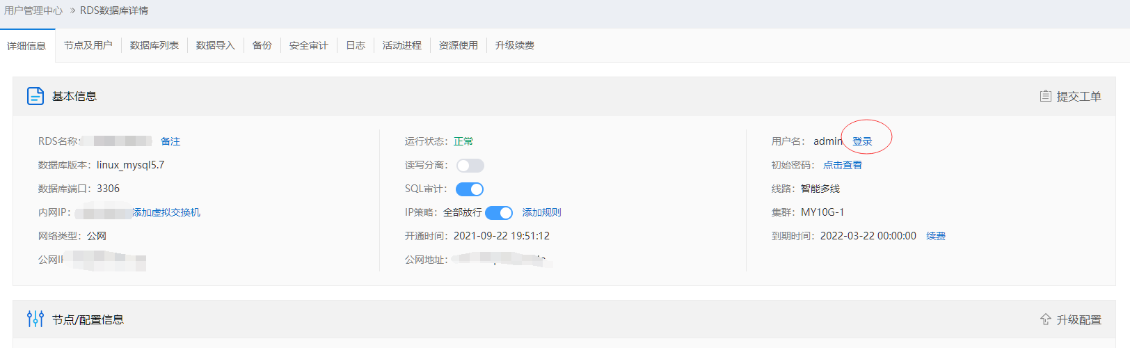 程序中用戶(hù)是admin,密碼通過(guò)后臺(tái)獲取,連接地址使用內(nèi)網(wǎng)地址(如果有公網(wǎng)可以用公網(wǎng)地址,但建議建立邏輯私網(wǎng)參考4.2,用內(nèi)網(wǎng)地址訪(fǎng)問(wèn)),端口用默認(rèn)的3306。密碼和內(nèi)網(wǎng)獲取如下圖。
