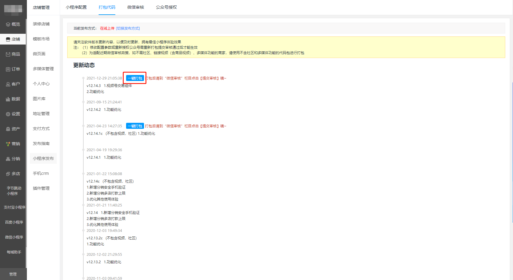 3、在后臺(tái)【店鋪-小程序發(fā)布-打包代碼】點(diǎn)擊【一鍵打包】