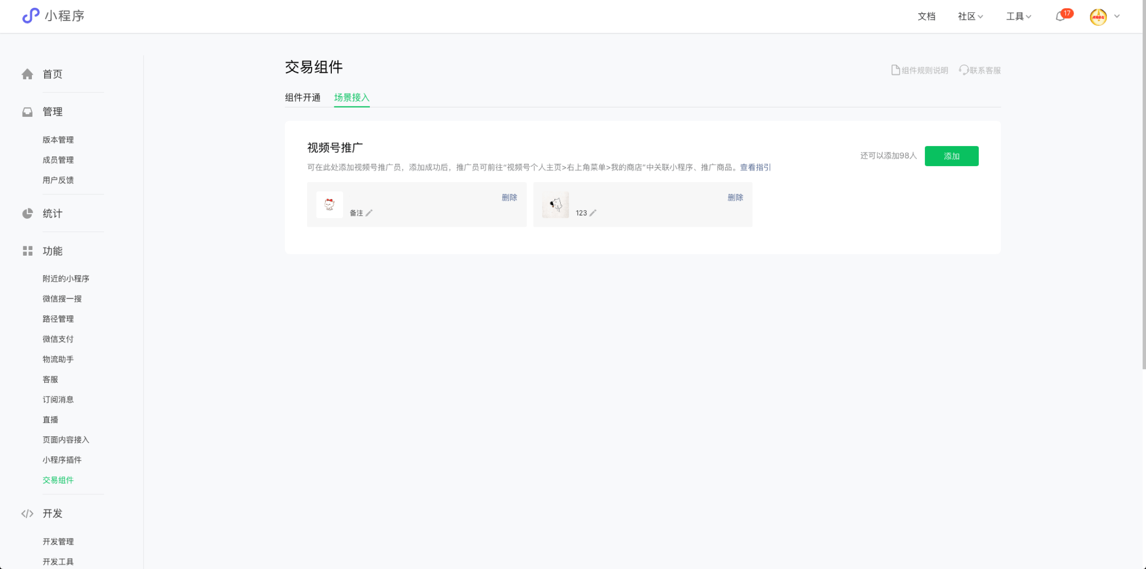 6、在后臺(tái)【店鋪-小程序發(fā)布】自行發(fā)布小程序 7、登錄小程序管理后臺(tái)(https://mp.weixin.qq.com/ ) 在【功能-交易組件-場景接入-視頻號推廣】點(diǎn)擊【添加】,將需要在視頻號展示商品的微信賬號設(shè)置為推廣員。