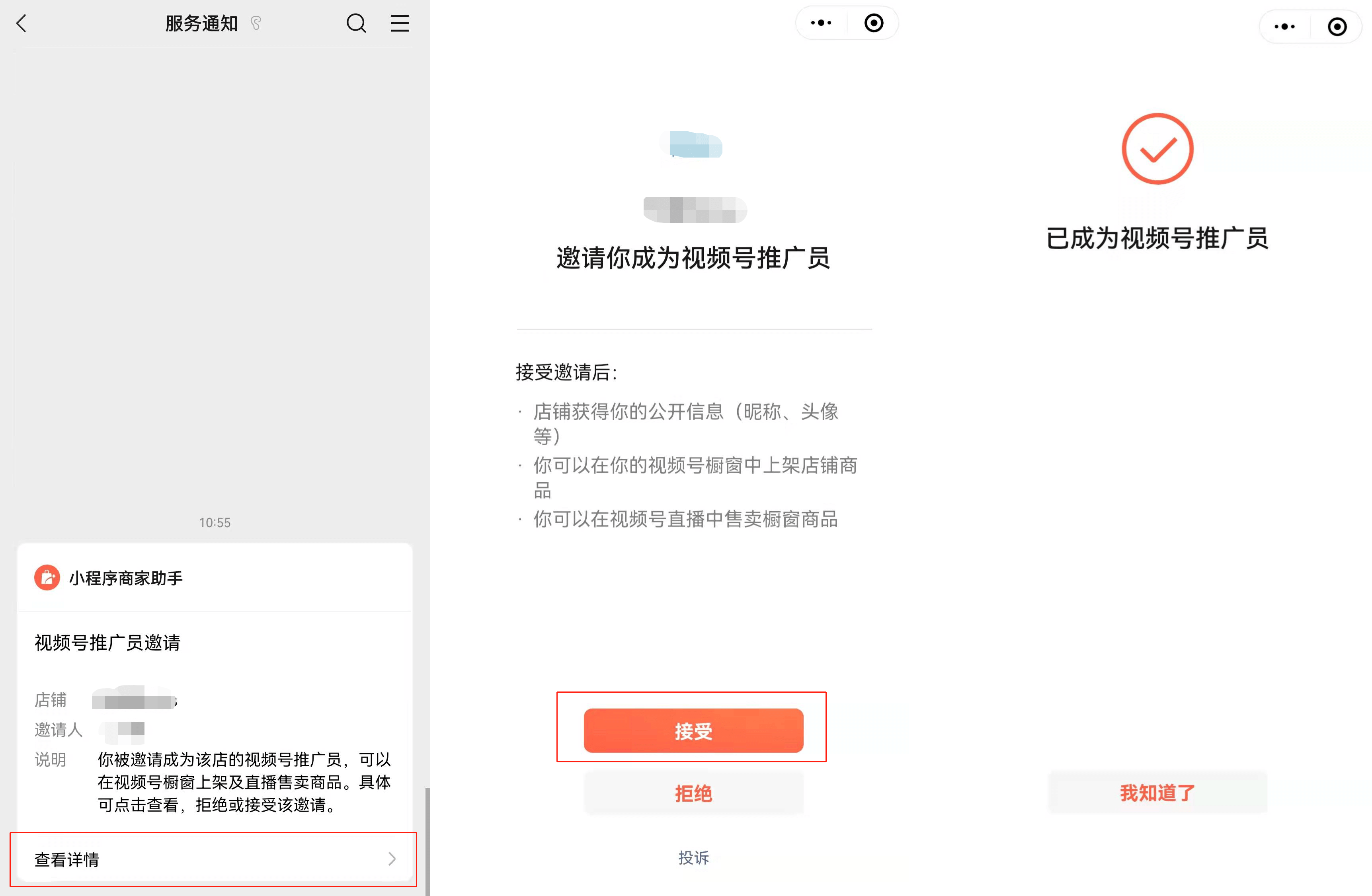 8、推廣員的微信將收到服務(wù)通知推送的視頻號推廣員邀請,點(diǎn)擊【查看詳情】,點(diǎn)擊【接受】,成功成為視頻號推廣員