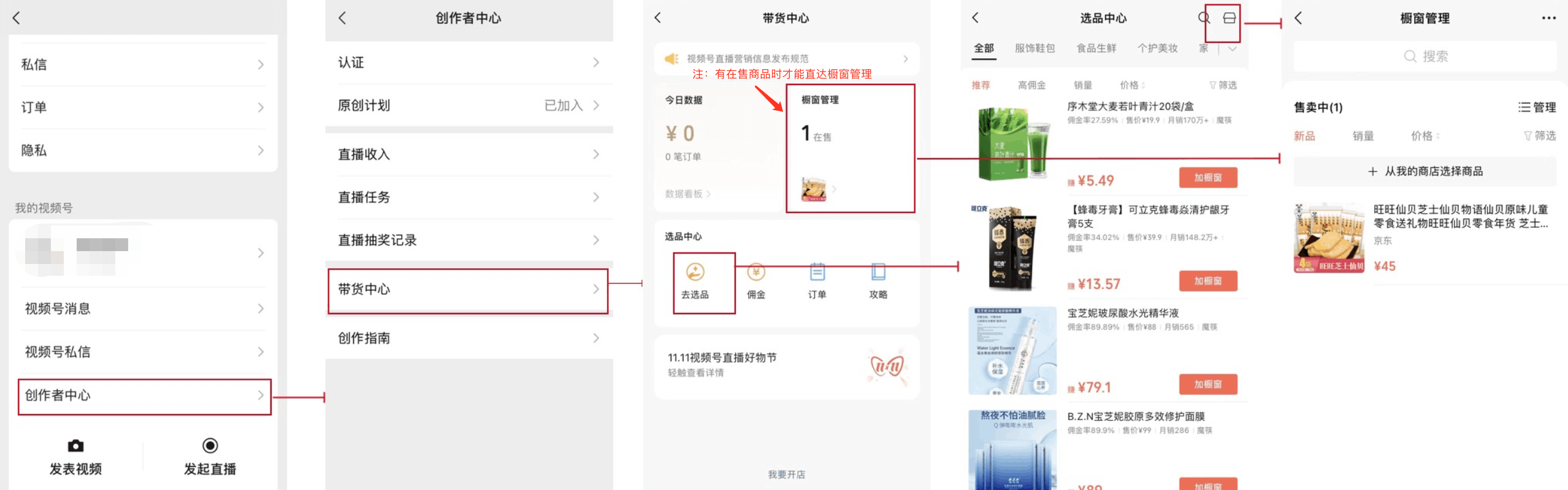 9、在微信的視頻號中點(diǎn)擊【右上角人像標(biāo)志】進(jìn)入視頻號個(gè)人中心, 點(diǎn)擊【創(chuàng)作者中心】, 點(diǎn)擊【帶貨中心】, 點(diǎn)擊【去選品或櫥窗管理】進(jìn)入選品中心, 點(diǎn)擊【右上角的店鋪標(biāo)志】,選擇商品添加到櫥窗。即可在視頻號個(gè)人主頁展示商品櫥窗同步小程序商品。
