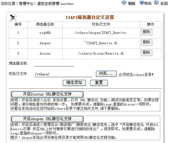虛擬主機(jī)開啟URLrewrite功能的方法介紹我司windows平臺(tái)的虛擬主機(jī)于2007年4月5日起,免費(fèi)支持Urlrewrite功能,用戶可以自己在虛擬主機(jī)管理中心點(diǎn)擊>isapi篩選器 discuz論壇和shopex網(wǎng)店系統(tǒng)已經(jīng)默認(rèn)支持,如果您要開啟,只需要在該頁面點(diǎn)“開啟”即可立即生效。 其他系統(tǒng),用戶可以自己將相關(guān)的dll文件上傳至others目錄,并點(diǎn)擊添加 ISAPI篩選器 即可生效!±碚撋峡梢灾С秩魏蜗到y(tǒng)的urlrewrite, 同時(shí)可以擴(kuò)展支持其他isapi篩選功能。 這個(gè)功能在業(yè)內(nèi)是絕無僅有的。