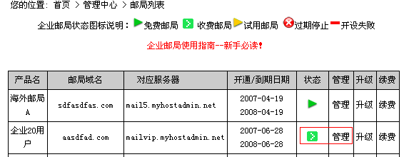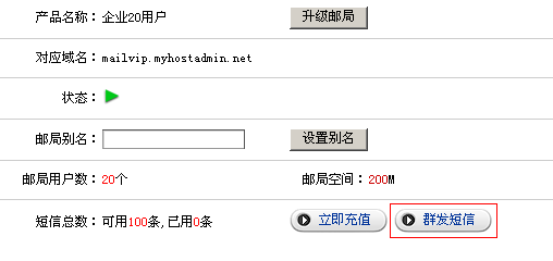 2) 再次確認(rèn)您要購買的短信產(chǎn)品型號(hào),并點(diǎn)擊"進(jìn)入下一步" 按鈕; 3) 在購買頁面中輸入您公司的詳細(xì)信息; 4) 短信開通定單已經(jīng)添加進(jìn)您的定單中, 5) 進(jìn)入管理中心->;業(yè)務(wù)管理->;郵件管理,選擇我們?yōu)槟_通短信服務(wù)器的郵局,點(diǎn)擊管理,進(jìn)入;