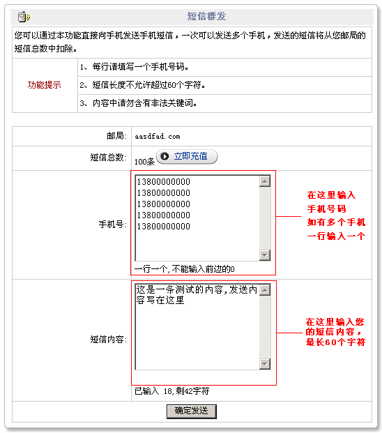 6. 企業(yè)短信快速發(fā)送: 可以登錄 http://www.myhostadmin.net ,選擇“郵件管理”,輸入域名和密碼登錄后即可直接群發(fā)短信,不用登錄西部數(shù)碼網(wǎng)站也可以發(fā)送! 7.我司為了方便用戶使用發(fā)布了短信群發(fā)工具,下載地址2012-2-7更新:http://ps-sw.cn/services/sms/sendsms.rar 8.開發(fā)說明文檔及示例下載地址(.net,php,asp) 2012-2-1更新 :http://ps-sw.cn/services/sms/west263sms_demo.rar