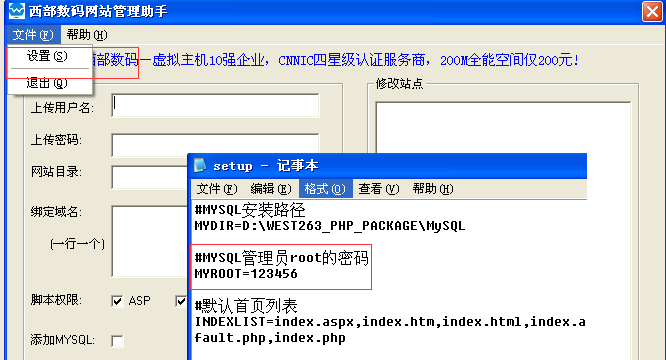 打開“西部數(shù)碼網(wǎng)站管理助手”,點文件>設(shè)置 在彈出的文件中,可以看見mysql的root默認密碼
