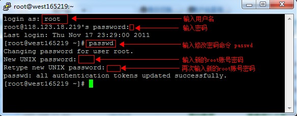 修改root密碼流程: 輸入賬號root,輸入密碼,登陸到linux。 輸入修改密碼的命令 passwd 根據(jù)提示輸入新密碼,輸入新密碼的時候,軟件不會顯示*號,輸入后回車就行了。如下圖: 修改完密碼后,先不要關(guān)閉客戶端,新開一個客戶端,用新密碼登陸測試是否修改成功,修改成功后再關(guān)閉客戶端。 (注意:若您使用的是webmin的管理平臺,登陸webmin的root密碼也將一起被修改)