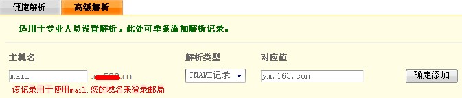首先點(diǎn)“DNS解析管理”--“高級(jí)解析”,主機(jī)名填寫“mail”,解析類型選擇“CNAME記錄”,對(duì)應(yīng)值填寫“ym.163.com”這點(diǎn)在增加網(wǎng)易域名郵箱那并無(wú)說(shuō)明,增加的目的是可以用mail.yourname.com來(lái)訪問,意思就是用mail.您的域名,來(lái)登陸郵局。