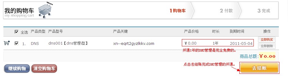 選擇購買年限后,然后點擊下一步,默認我司提供了一年免費的服務。 4、系統(tǒng)會自動跳轉(zhuǎn)到購物車,確認好開通的域名和年限正確后,點擊“去結賬”即可完成整個的購買流程。