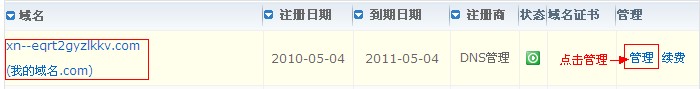 7、在域名管理中找到剛才開通的DNS管理,點擊右側的“管理”: