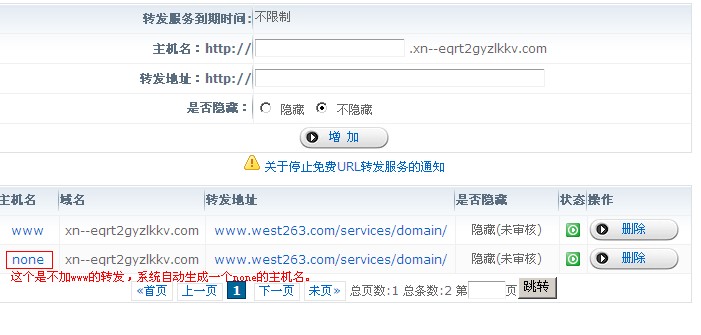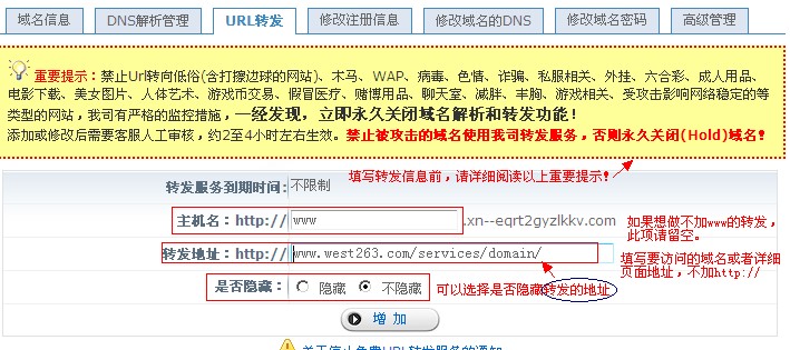 在設置轉(zhuǎn)發(fā)前,先仔細閱讀“重要提示”,確定您的轉(zhuǎn)發(fā)內(nèi)容不在以上禁止內(nèi)容的范圍之內(nèi)。 如需轉(zhuǎn)發(fā)www的域名如“www.我的域名.com”,主機名填寫www;如需轉(zhuǎn)發(fā)頂級域名如“我的域名.com”, 主機名請留空。設置好是否隱藏,點增加就可以了。轉(zhuǎn)發(fā)設置后,我司將會審核轉(zhuǎn)發(fā)地址, 如果是剛修改了DNS服務器地址,則需24小時左右生效,請耐心等待。 轉(zhuǎn)發(fā)結果如下圖,不加www的轉(zhuǎn)發(fā),系統(tǒng)生成后的主機名是“none”: