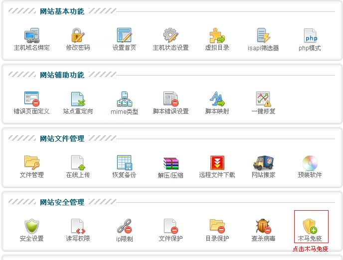 3、在“網站安全”里找到“木馬免疫”: