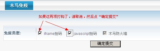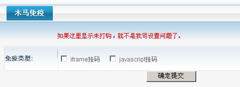 4、在木馬免疫中,取消“iframe掛馬”和“JavaScript掛馬”的勾,然后點“確定提交”重新登錄shopex后臺,一般就能可視化編輯了。