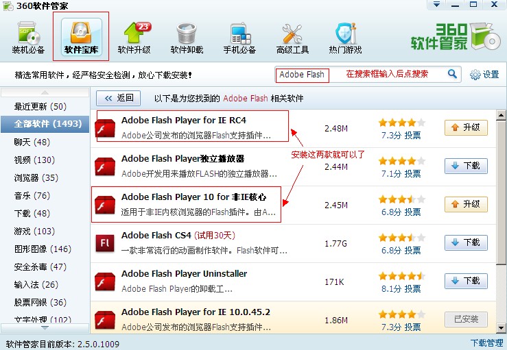 打開360安全衛(wèi)士,點擊“軟件管家”,然后點擊“軟件寶庫”,搜索Adobe Flash,然后按照以下圖示,選擇安裝,安裝好以后,重新打開瀏覽器就可以正常使用了。