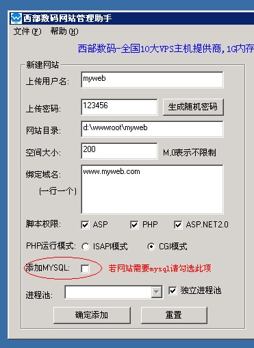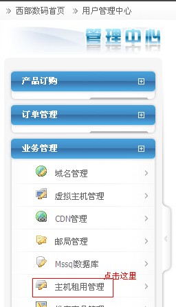 2、雙擊桌面上的“西部數(shù)碼網(wǎng)站管理助手”,打開管理助手: 首先設(shè)置上傳用戶名、密碼,網(wǎng)站目錄會自動生成?臻g大小若不想限制,請設(shè)置為0.綁定域名的時候,每一行填寫一個,為了您網(wǎng)站的安全,請勾選您網(wǎng)站所屬的腳本。如您的網(wǎng)站是PHP程序,建議只勾選PHP。在PHP運(yùn)行模式此處,如果是discuz論壇或者康盛創(chuàng)想的程序,請選擇ISAPI模式,CGI模式有可能造成程序不穩(wěn)定。如果需要mysql數(shù)據(jù)庫,請勾選“添加MYSQL”,再點確認(rèn)添加就可以了。做完這些,已經(jīng)完成了一半的工作啦。 3、接下來就是最重要的步驟了。 首先、回到我們網(wǎng)站的管理中心—業(yè)務(wù)管理—主機(jī)租用管理。