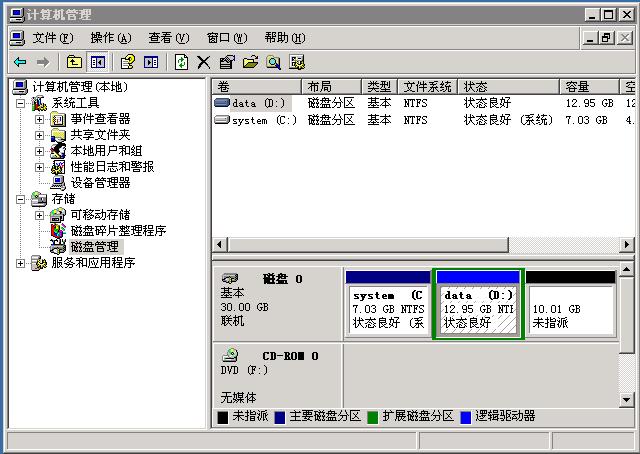升級vps、云主機如何增大數據磁盤的大小我們從 我的電腦-右鍵-管理 打開計算機管理后,找到磁盤管理