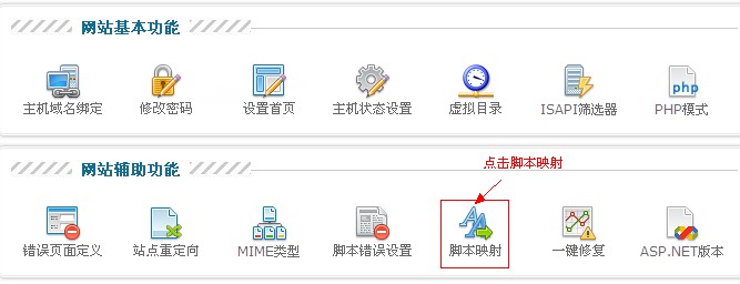 3、進(jìn)入虛擬主機(jī)管理面板,(也可以通過www.myhostadmin.net選擇“虛擬主機(jī)”直接登錄到虛擬主機(jī)管理面板)。在虛擬主機(jī)管理面板點(diǎn)擊“腳本映射”,如圖: