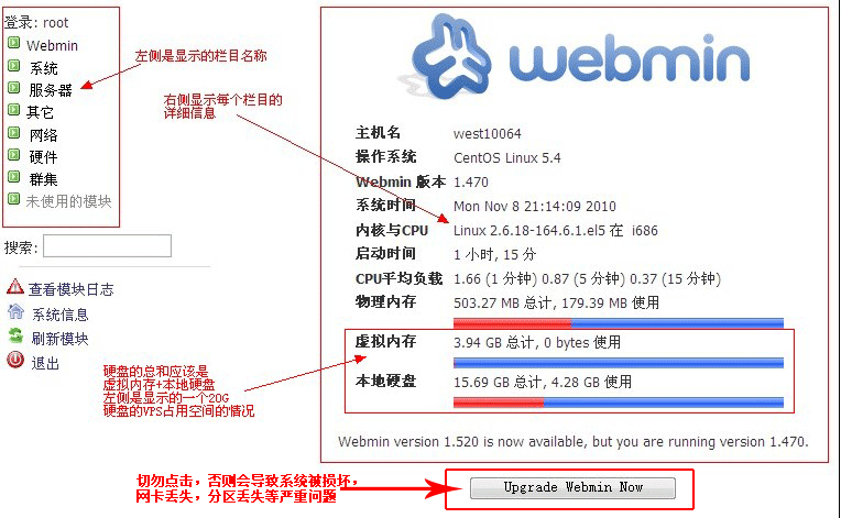 "Upgade Webmin Now" 升級功能一般不推薦使用,特別是這里面的升級內核的功能,切勿點擊,否則會導致系統被損壞,網卡丟失,分區(qū)丟失等嚴重問題。
