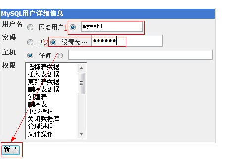 e、輸入用戶名、密碼,主機選擇“任何”,點擊新建。如圖: