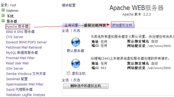 5、接下來我們建立站點: a、 點擊左側“服務器”—“Apache服務器”,然后點擊右側“添加虛擬主機”,如圖: